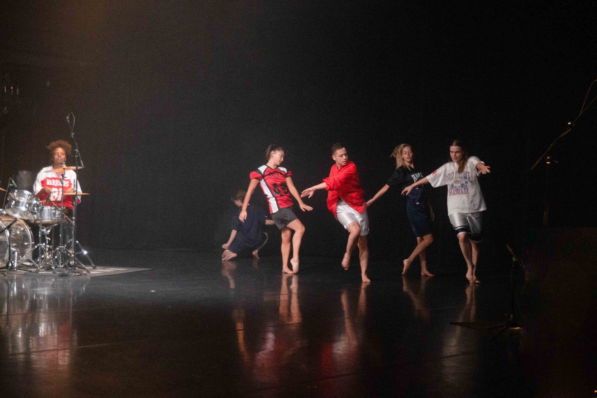 2016 koreograferade jag två verk som svarade lite mot Butlercitatet: Rudy och en lagsportig punkbalett för trummisar och en stor grupp dansare (i uruppförandet 13 dansare och 3 trummisar[7]) som var inspirerad av den kraftfulla känslan av att göra stora baletthopp i flock över rummet på dansklass, och av en amerikansk TV-serie om ett fotbollslag och deras “bromance”. Verket heter How to do things with Romance: a prologue och kompositionen är också influerad av riot Girrrl punk, körsångskompositioner och sportromantiska filmer jag stött på.