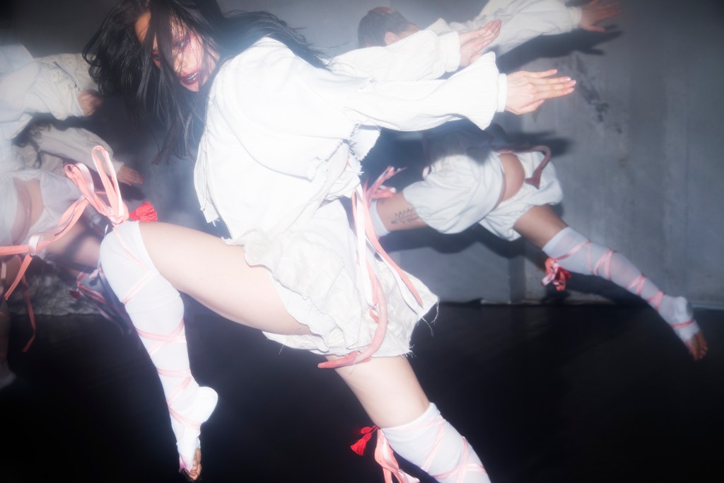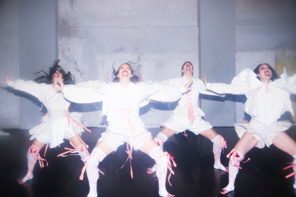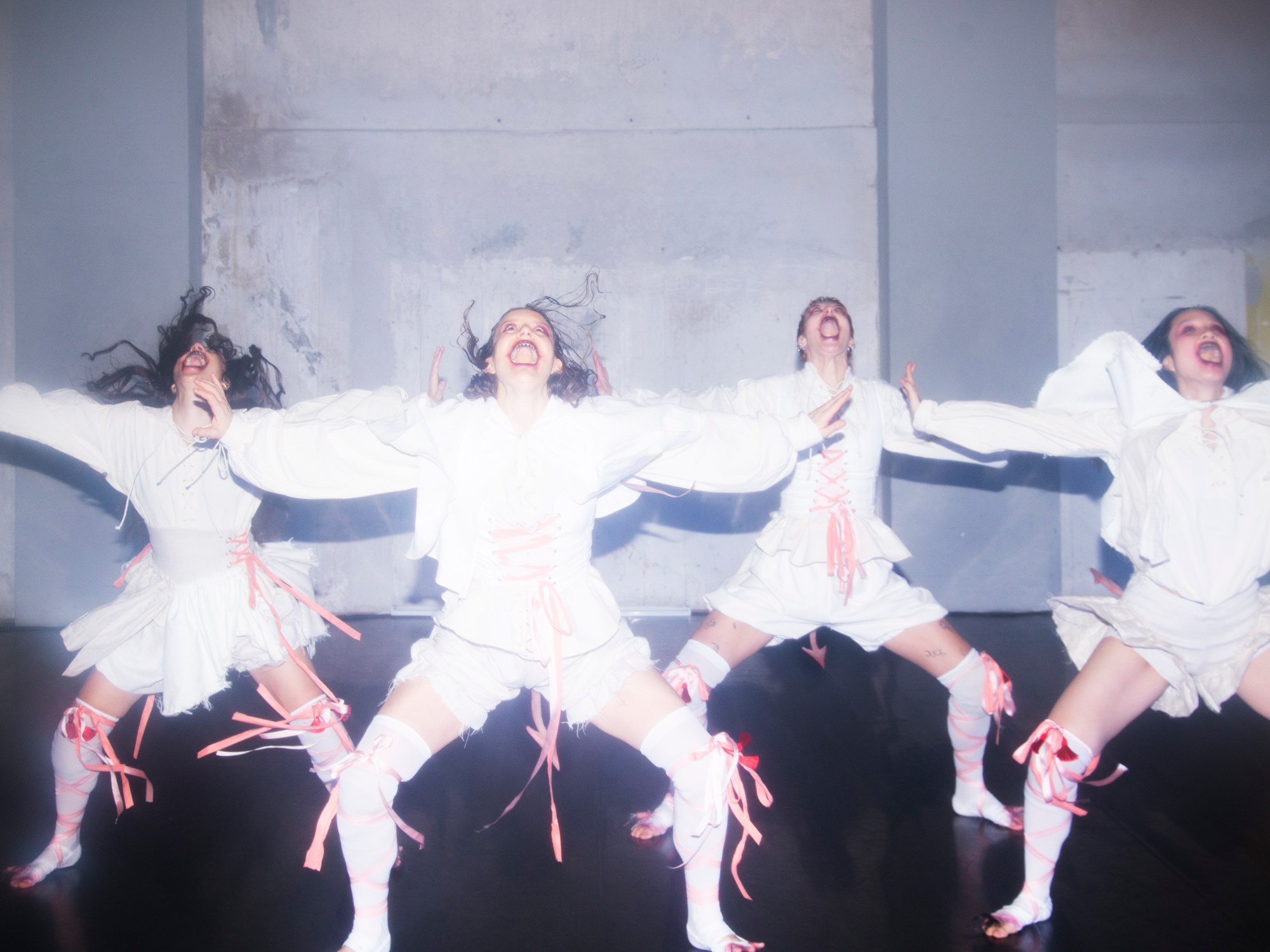 För till skillnad från i ”Spökdanser” på MDT förra våren är Söderhult inte ensam på scenen. ”Blessika” är uppföljaren i den trilogi där hon undersöker ”dans som en hemsökt konstform”, och här har hon sällskap av de förföriska dansmonstren Cajsa Godée, Nathalie Wiberg och Catarina Zarazua Mujo. Som vitklädda varelser med utsmetat mörker kring de leende läpparna och köttfärgade sidenband fladdrande kring knästrumporna stöter de fram genom luften i den takhöga danskällaren på Weld.