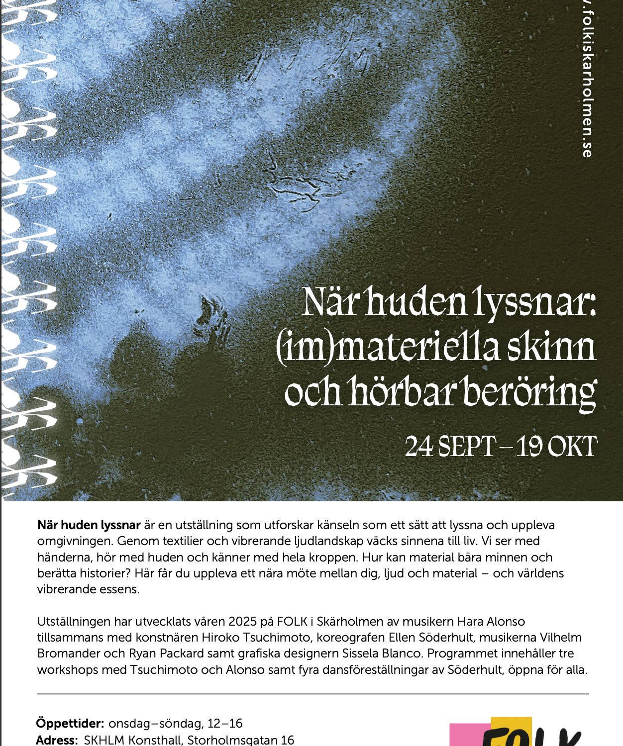 Under utställningen hålls tre workshops med Hiroko Tsuchimoto och Hara Alonso, samt fyra dansföreställningar av Ellen Söderhult, öppna för alla. Mer information om dessa finns på vår hemsida!